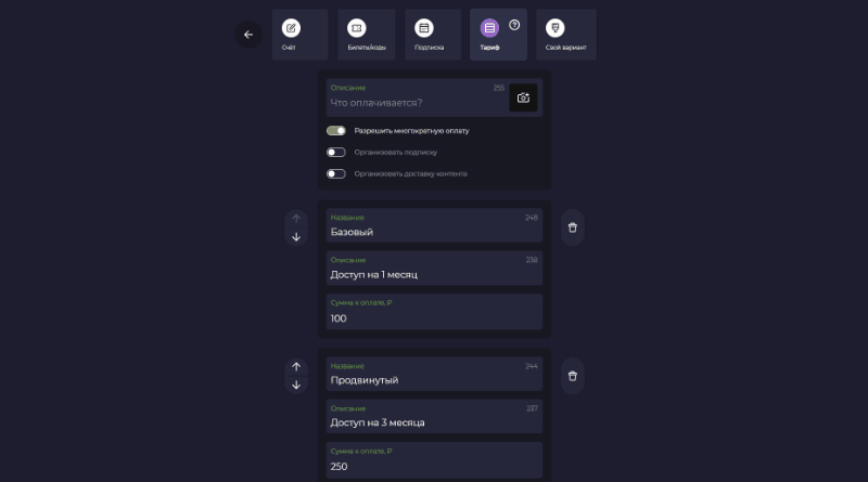 Шаг 4. Чтобы настроить варианты оплаты, выберите “Создать” и “Тариф”. Если активировать “Организовать подписку”, то сумма будет списываться каждый указанный период. При переходе по ссылке или после сканирования QR-кода на странице оплаты подписчик выберет удобный вариант.