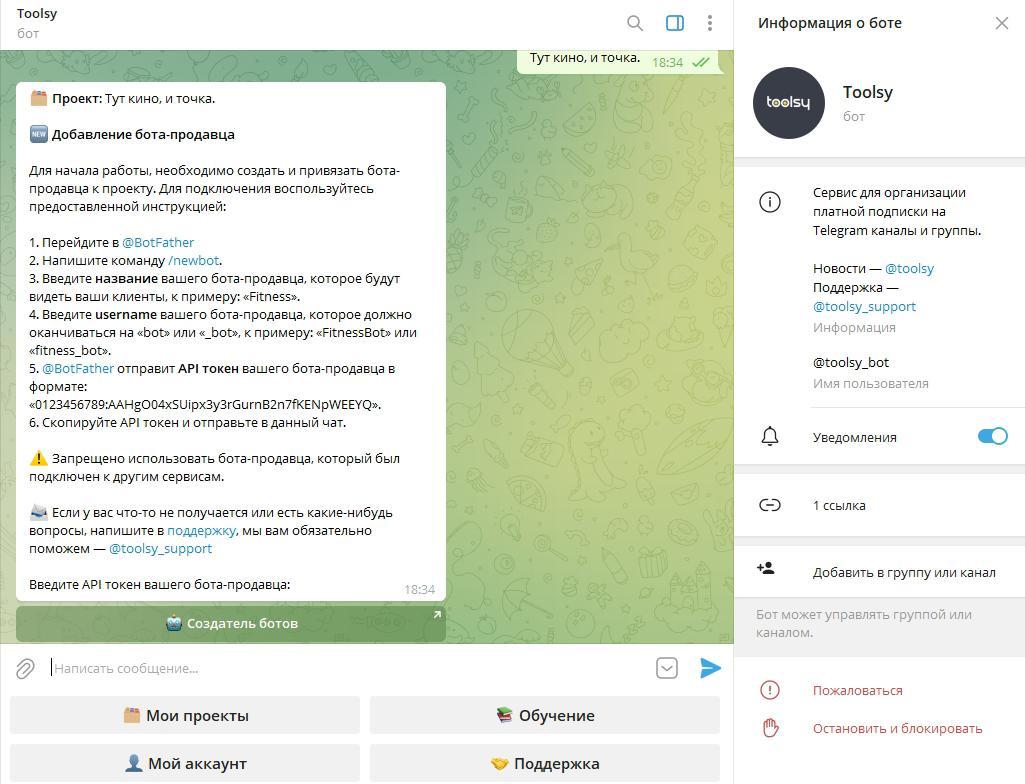 Шаг 2. Создайте бота-продавца по инструкции. Через него Toolsy будет управлять подпиской на ваш канал.
