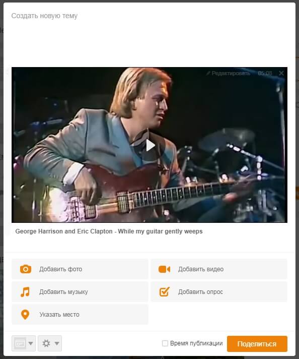 После того, как добавлено видео и при желании написан текст, остаётся только нажать кнопку «Поделиться» слева внизу. Теперь ваш пост опубликован