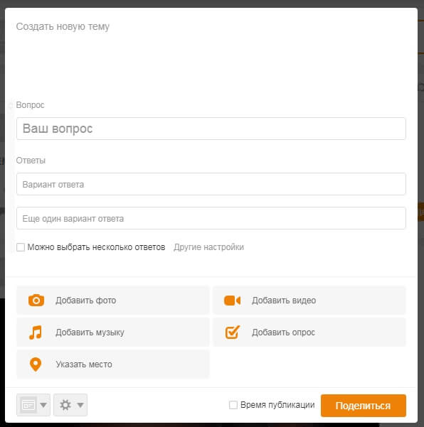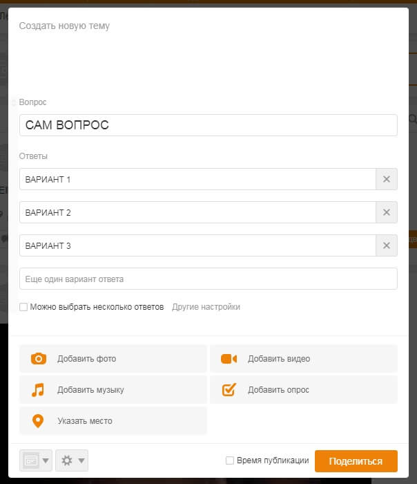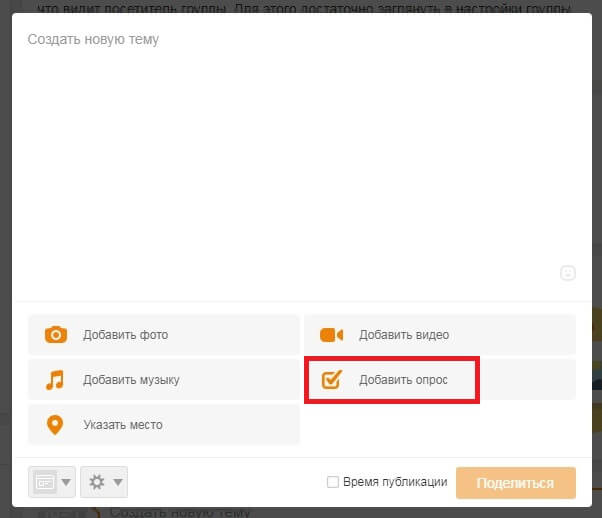 Чтобы создать опрос в Одноклассниках, поставьте курсор в поле «Создать новую тему. В появившемся окне нажимаем на кнопку «Добавить опрос».