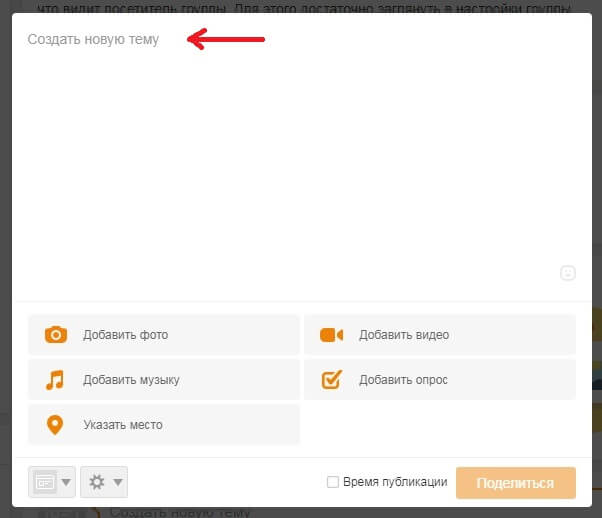 Чтобы создать пост, поставьте курсор в поле «Создать новую тему. В появившемся окне просто вводим интересующий нас информационный текст.