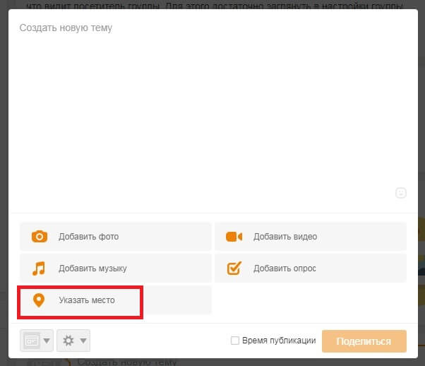 Чтобы добавить карту, поставьте курсор в поле «Создать новую тему. В появившемся окне нажмите на кнопку «Указать место».