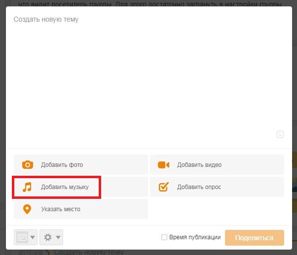 Чтобы создать публикацию с аудиозаписью, поставьте курсор в поле «Создать новую тему. В появившемся окне нажимаем на кнопку «Добавить музыку».