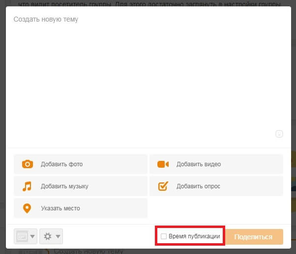 Для создания поста, который не опубликуется до определённой даты, поставьте курсор в поле «Создать новую тему. В появившемся окне ставим галочку на кнопку «Время публикации».