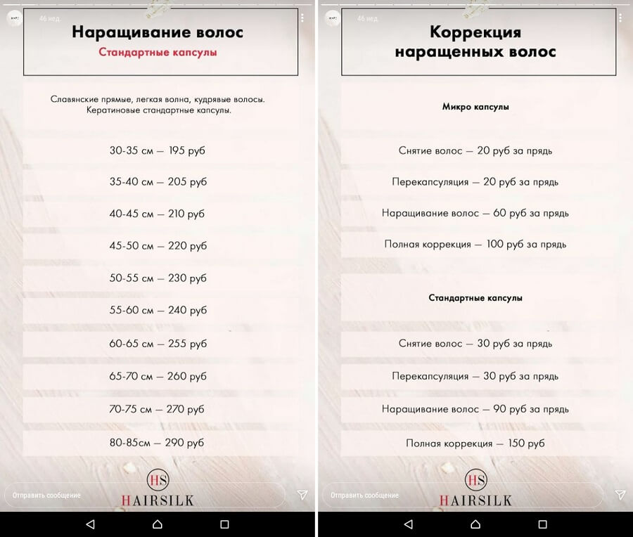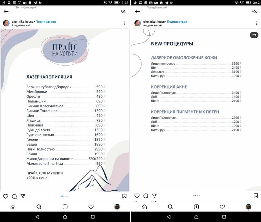 Если одна услуга подразумевает разную стоимость, то нужно расписать все цены на эту услугу в одной сторис/посте. Например, цена стрижки или наращивания зависит от длины волос. Стоимость лазерной эпиляции зависит от зоны.