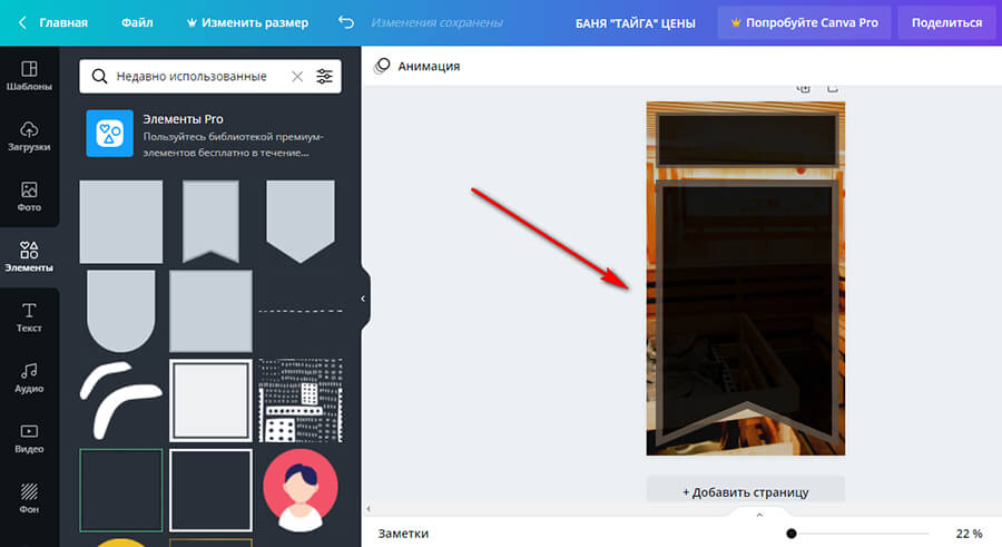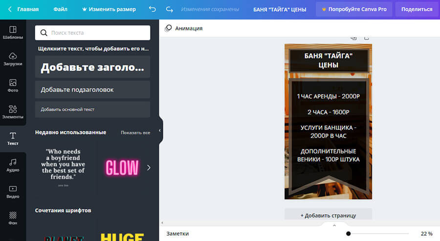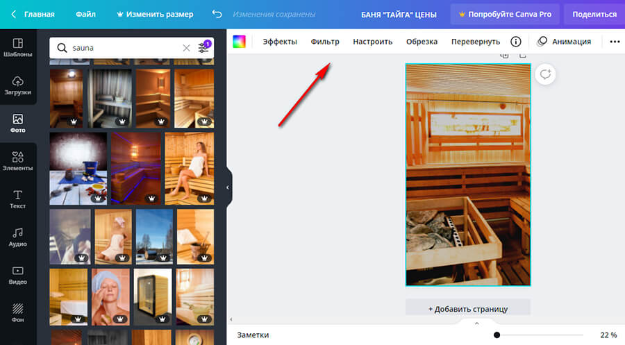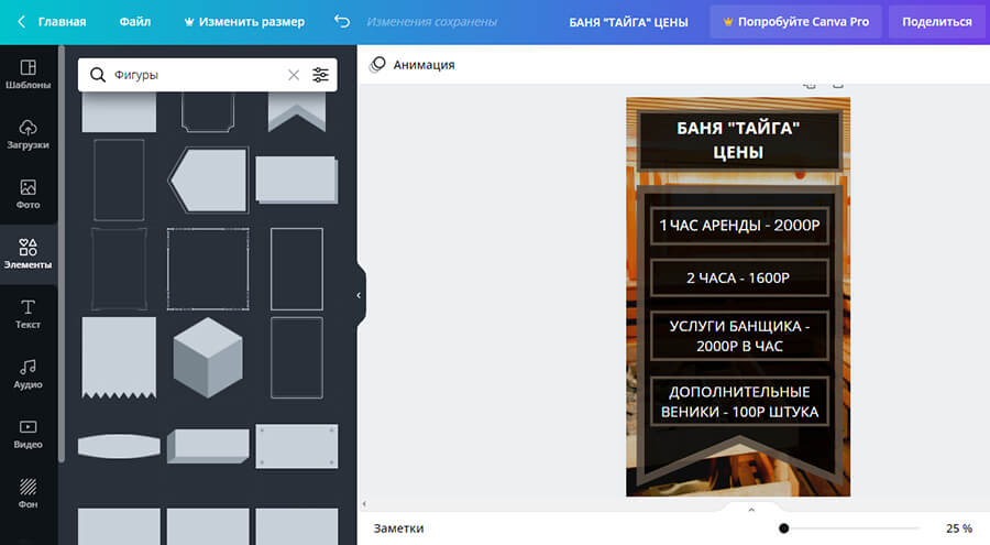 Для примера делаем прайс бани. На фон ставим фото бани, немного редактируем цветокоррекцию (настройки появляются, если нажать на фото).