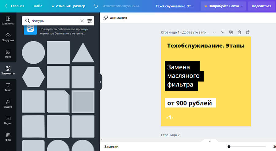 Шаг 3. Добавляем плашки для текста (названия и цен). Находим фигуры в разделе «Элементы» и подгоняем под нужные размеры. Также настраиваем цвета.