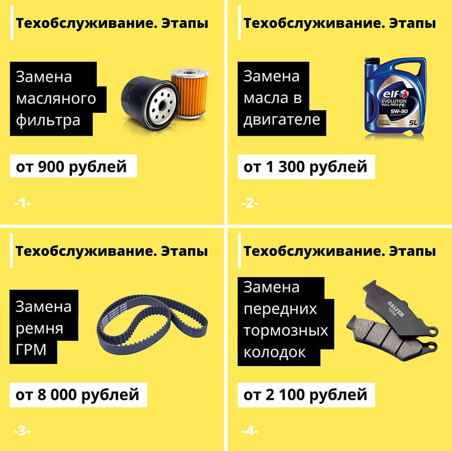 Допустим, у нас 10 этапов от замены фильтров до колодок. Для примера возьмем 4: