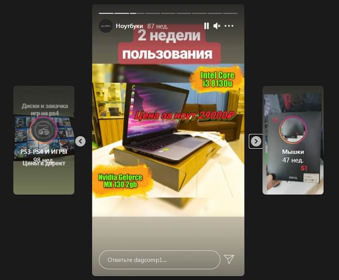 Вот неудачный пример оформления — цену надо выискивать глазами, шрифты и цвета не сочетаются. Оформление выглядит дешевым. Текст и плашки отвлекают от самого товара. Учитывая, что ноутбук снят не на однотонном фоне в сумме получается слишком много цветов на сторис, и это тоже отвлекает и мешает восприятию информации.