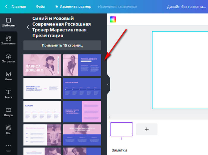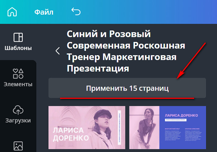 Чтобы использовать все слайды кликаем на кнопку «Применить 15 страниц» (там может быть любое количество).