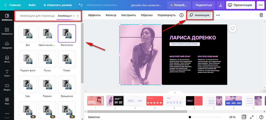 Шаг 5. Если презентация будет экспортироваться в видео, можно настроить анимацию. В некоторых шаблонах она есть по умолчанию. Для изменения эффекта кликаем на слово «Анимация» в верхней части панели и выбираем нужный. Анимацию можно настроить как для отдельного объекта (например, фото), так и для страницы в целом.