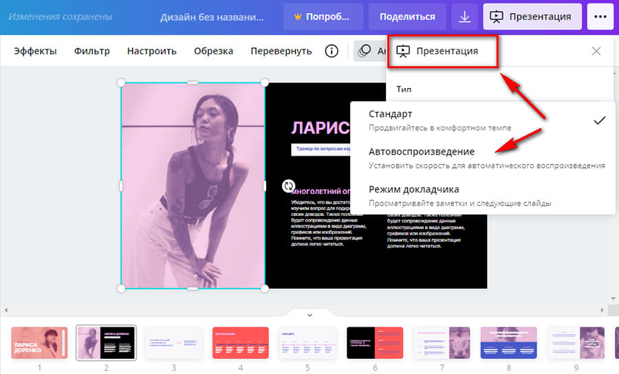 Шаг 6. Сохраняем презентацию. Если вы планируете сами переключать слайды по мере рассказа, советуем сохранить их как последовательность изображений. Если это будет видео, стоит установить интервалы автовоспроизведения (кликаем на кнопку «Презентация» и настраиваем).