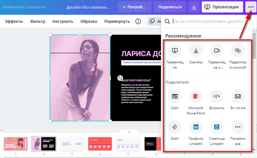 Презентации, сделанные в Canva, можно сохранять не только в виде файла. Можно поделиться ссылкой — любой человек сможет просмотреть ее без авторизации в Канве. Можно встроить презентацию на сайт, экспортировать в PowerPoint, поделиться в сервисе Slack. Также можно записать закадровый голос. Все эти настройки открываются при нажатии на меню презентации — 3 точки в правом верхнем углу.