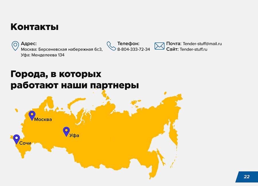 P.S. В продающих презентациях часто пропускают введение, а сразу начинают с перечисления «проблем» и потребностей клиента. И предлагают решение. Пример — все та же презентация TenderStuff. Здесь на втором слайде описывают «проблему» — необходимость организаций участвовать в тендерах согласно закону. А на третьем слайде сразу показывают, как эту проблему можно решить. Оба слайда с УТП.