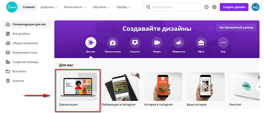 На главной Canva находим раздел «Презентация», кликаем. Разрешение 1920 х 1080 рх.