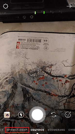В самой нижней строчке и находим надпись «Прямой эфир». Жмем на нее и затем на большую белую кнопочку.