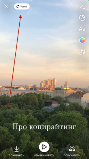 Выбираем, как хотим поделиться этим видеороликом, а затем записываем свою Историю или берем готовый медиафайл с телефона. Клип будет прикреплен к нашему видео или фотографии ссылкой. Об этом свидетельствует стрелочка вверху экрана.