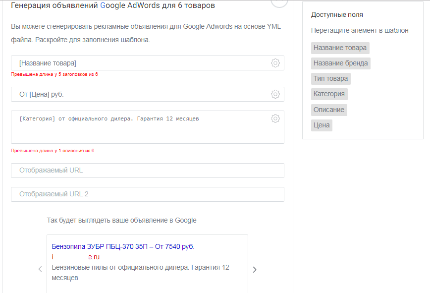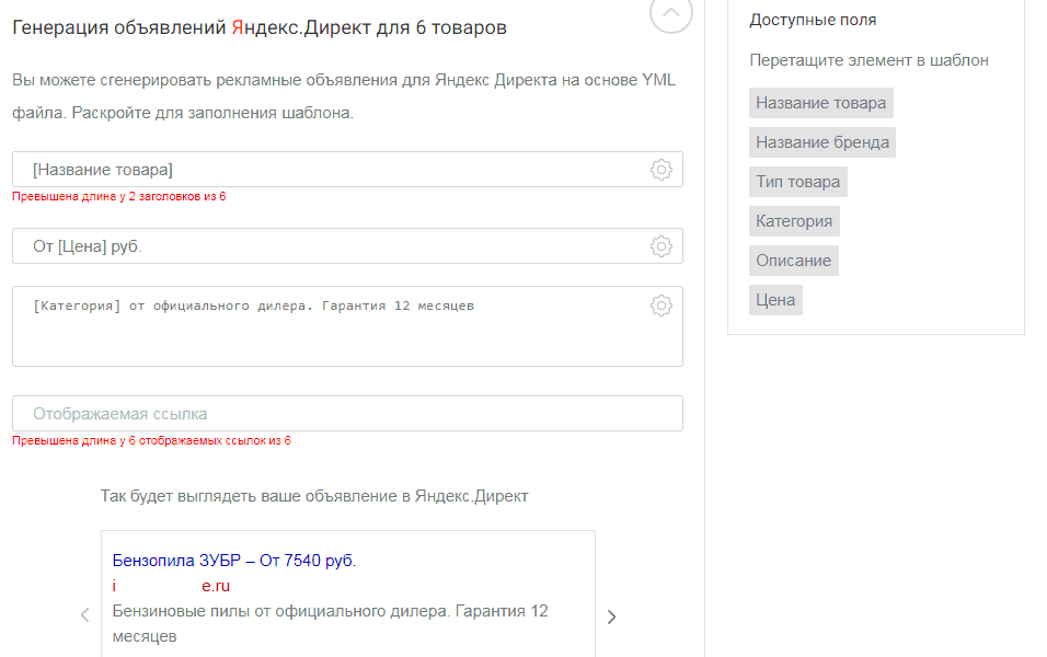 Максимальное количество слов. Например, установите лимит в 2-3 слова для заголовка 1. Так в большинстве случаев вы будете получать нормальные объявления. Но просмотреть список готовых объявлений все равно стоит. Если попадется товар с длинными словами в названии, лимит символов будет превышен.