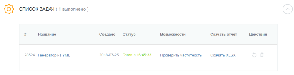 После того как инструмент сгенерирует ключи и объявления, скачайте готовый отчет в XLSX. Для этого раскройте Список задач и загрузите XLSX-файл.