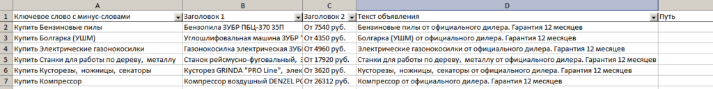 - сгенерированные ключевые фразы и объявления выгружаются в XLSX-файле;