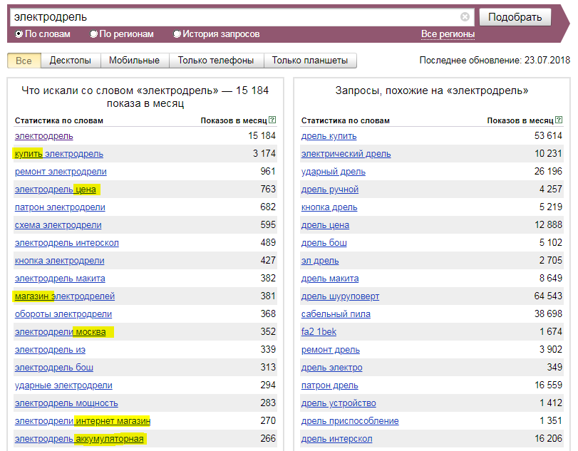 Теперь покажем, как это делать на практике. Для примера введем в Вордстате запрос «электродрель». Вордстат показывает нам список фраз, которые содержат это ключевое слово: