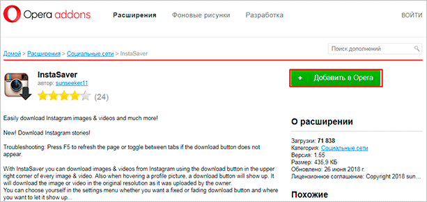 Для этого браузера есть хорошее дополнение InstaSaver. Оно сохраняет фотографии и видеофайлы из Stories и обычных публикаций. Заходим в меню обозревателя и находим нужный раздел.