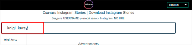 Это удобное решение, так как не нужно устанавливать дополнительное ПО. Один из популярных ресурсов – weynstag.com. Чтобы воспользоваться им, откройте социальную сеть в браузере и скопируйте имя пользователя, чью Историю вы хотите сохранить.