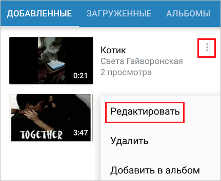Рядом с каждой записью есть 3 точки, под которыми прячется выпадающее меню. Нажимаем на них. Если в списке действий есть слово «Редактировать», эту видеозапись можно скрыть.