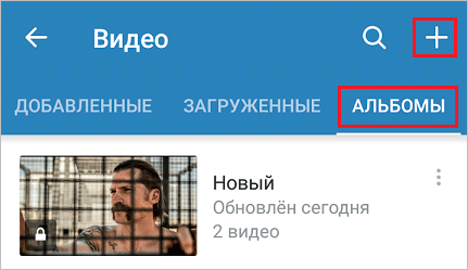 В разделе с видеоматериалами есть вкладка «Альбомы». Заходим туда и нажимаем на плюсик в углу экрана.