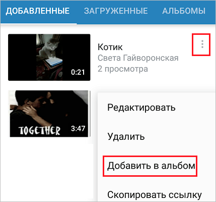 Для этого снова жмем на 3 точки и выбираем «Добавить в альбом».