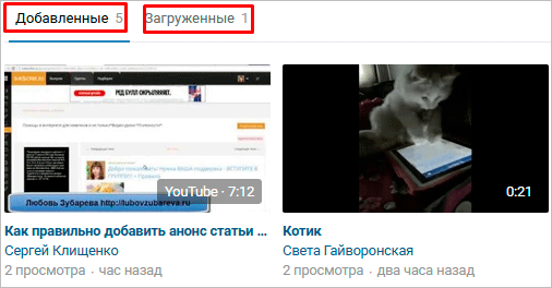 Заходим в свои видеоматериалы, нажав на соответствующую ссылку в профиле. В разделе «Мои видеозаписи» есть 2 вкладки: «Добавленные» и «Загруженные».