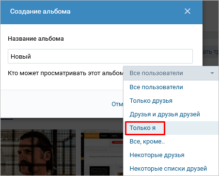 В разделе «Мои видеозаписи» можно не только загружать, просматривать и удалять ролики, но и добавлять их в папки для более удобного хранения. Мы создадим альбом, назову его «Новый» и оставлю доступ только себе.