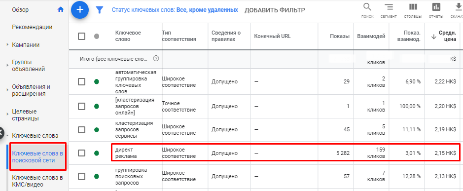 - Стоимость трафика по ключам в точном соответствии выше, чем при показах по ключам в широком соответствии.