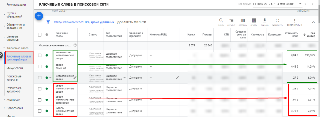- если конверсий нет или их стоимость слишком высокая, отключайте такие ключевики.