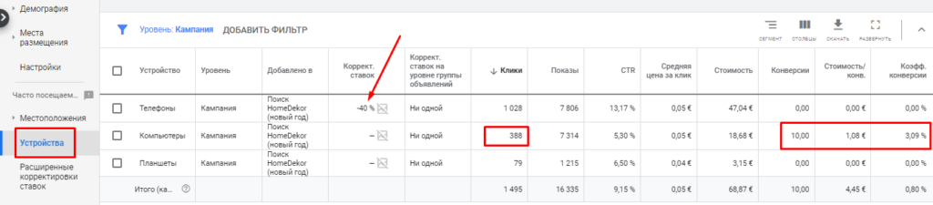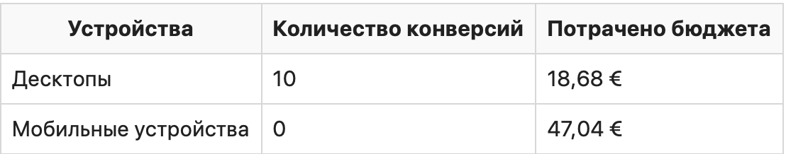 Итого: смартфоны «съели» в 2,5 раза больше бюджета, чем десктопы, но при этом обеспечили 0 конверсий. А с десктопов (куда потратили немного денег) получили 10 конверсий по более низкой цене.