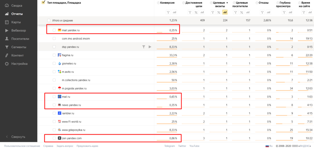 Если вы активно используете рекламу в медийных сетях (РСЯ и КМС), не забывайте отслеживать эффективность этих источников. На некоторых площадках, где показываются ваши объявления, нередко случаются скликивания или нецелевые посещения.