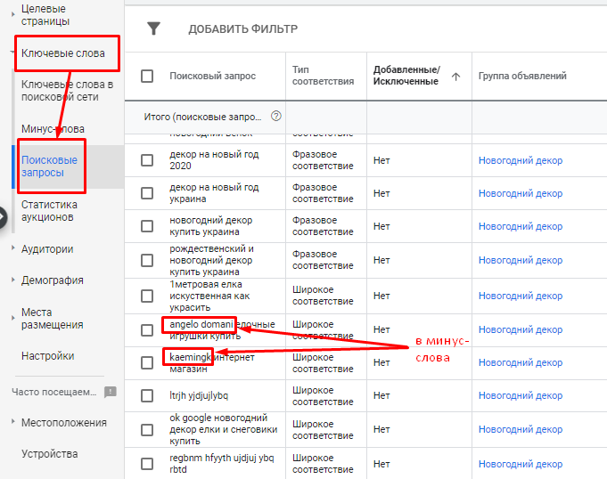 Здесь вы увидите полный перечень запросов, по которым показывались ваши объявления. Запросы, которые ведут нецелевой трафик, добавляем в минус-слова.