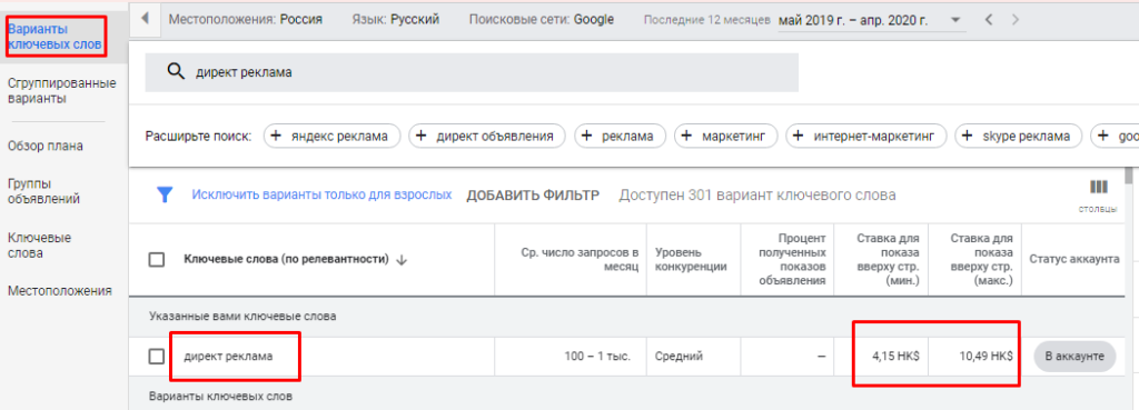 Теперь посмотрим, сколько стоит клик в топе выдачи по этому запросу. Посмотреть эти данные можно в Планировщике ключевых слов Google.