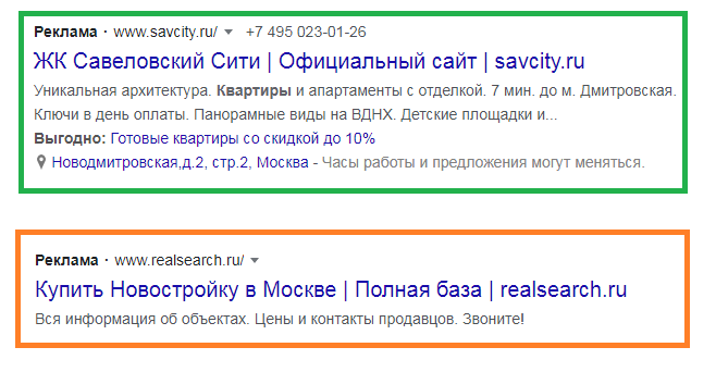 Второе объявление существенно проигрывает первому. У первого используются расширения, объявление занимает больше места в выдаче.