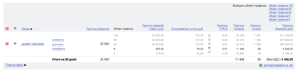 Точно так же следует поступать и при подготовке кампаний в Яндекс.Директе. Средние ставки для показа на первых позициях можно посмотреть в инструменте «Прогноз бюджета».