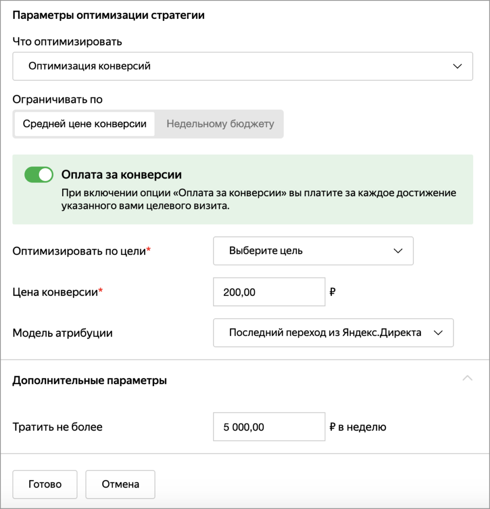 Обратите внимание! В вашем аккаунте может быть недоступна модель оплаты за конверсии. Подробнее о том, по каким причинам это может происходить — здесь.