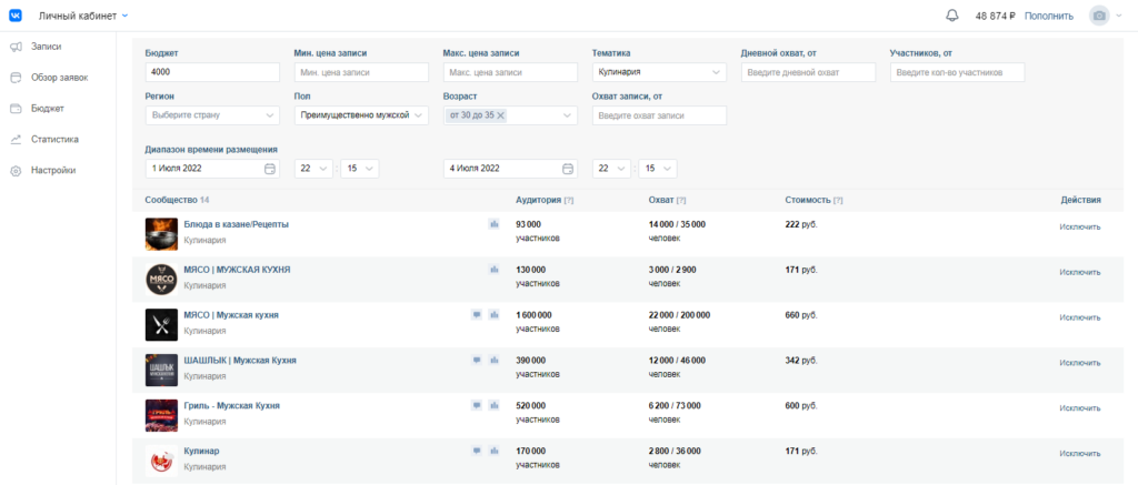 Перед публикацией вы можете задать возраст и пол участников, тематику, регион и другие параметры. Конечно, аудитория, которая увидит рекламный пост в сообществе, будет холоднее, чем подписчики конкурентов, но ее будет много и она будет дешевая.