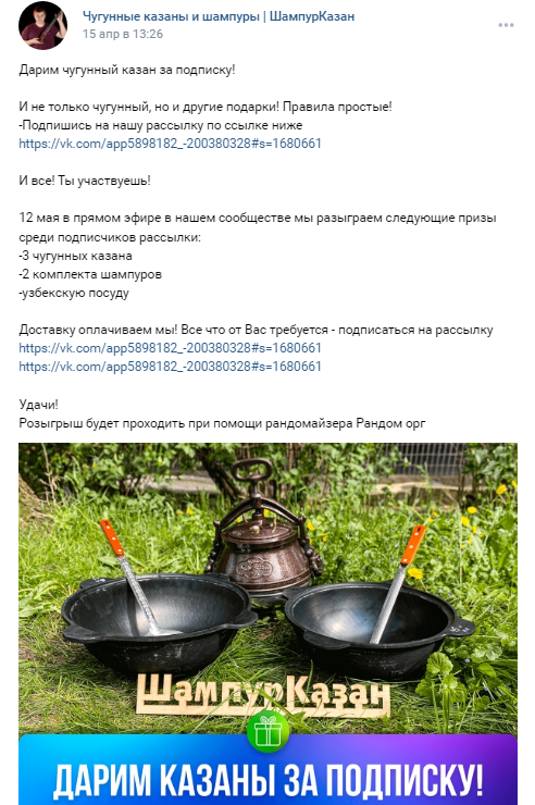Главная задача конкурса – не развлечь аудиторию, а увеличить CTR и конверсию в подписку. Старайтесь разыгрывать именно свою продукцию.