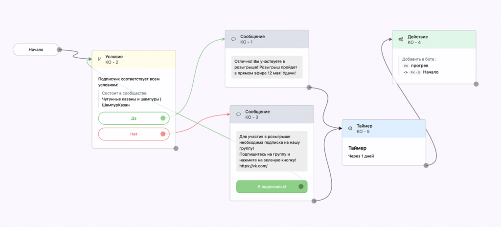 - Укажите, чтобы бот проверял, подписан пользователь на сообщество или нет, и отправлял сообщения об том. Если подписки нет, то участие в розыгрыше невозможно.