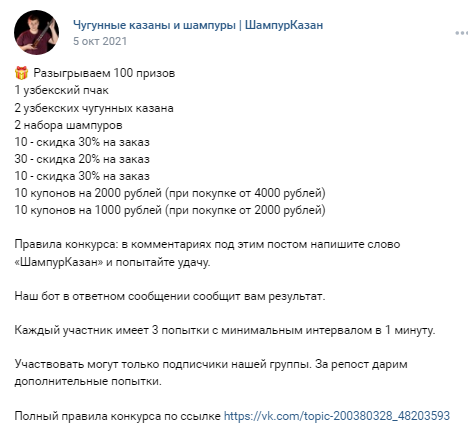 Например, у вас есть магазин одежды для карате. Вы проводите конкурс и предлагаете в качестве приза iPhone. Конечно, он нужен практически всем, поэтому в конкурсе будет принимать участие не только ваша целевая аудитория.