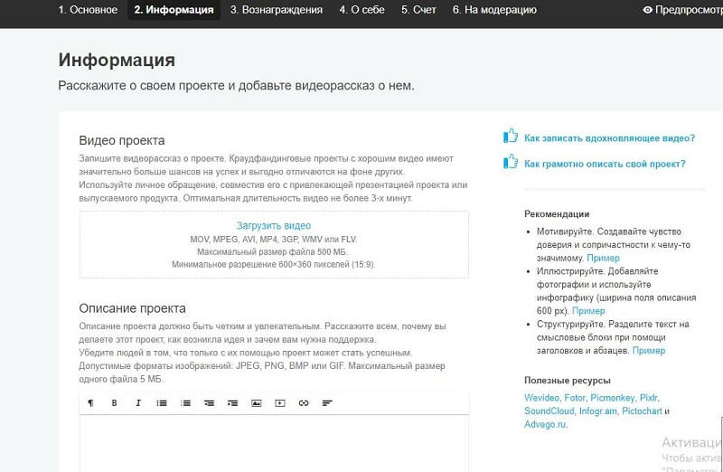 Заполняем графы с названием, вставляем файл обложки проекта, пишем описание, выбираем категорию и т.д. Каждая графа имеет подсказку. На странице есть и ссылка- помощь – как создавать успешные проекты.