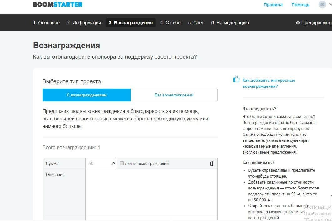 11. Вознаграждение – заполняем графы на странице, используя подсказки и рекомендации от Boomstarter, предварительно выбрав, будет проект С или БЕЗ вознаграждения.