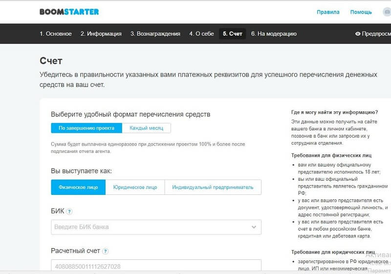 13. Счет – здесь будет вся платежная информация и от того, насколько правильно и внимательно этот раздел будет заполнен, зависит получение денег и время их зачисления. Пользуйтесь советами и подсказками, расположенными справа страницы.