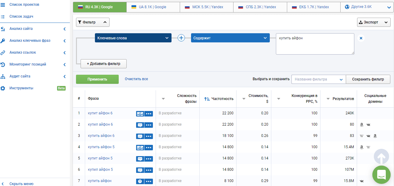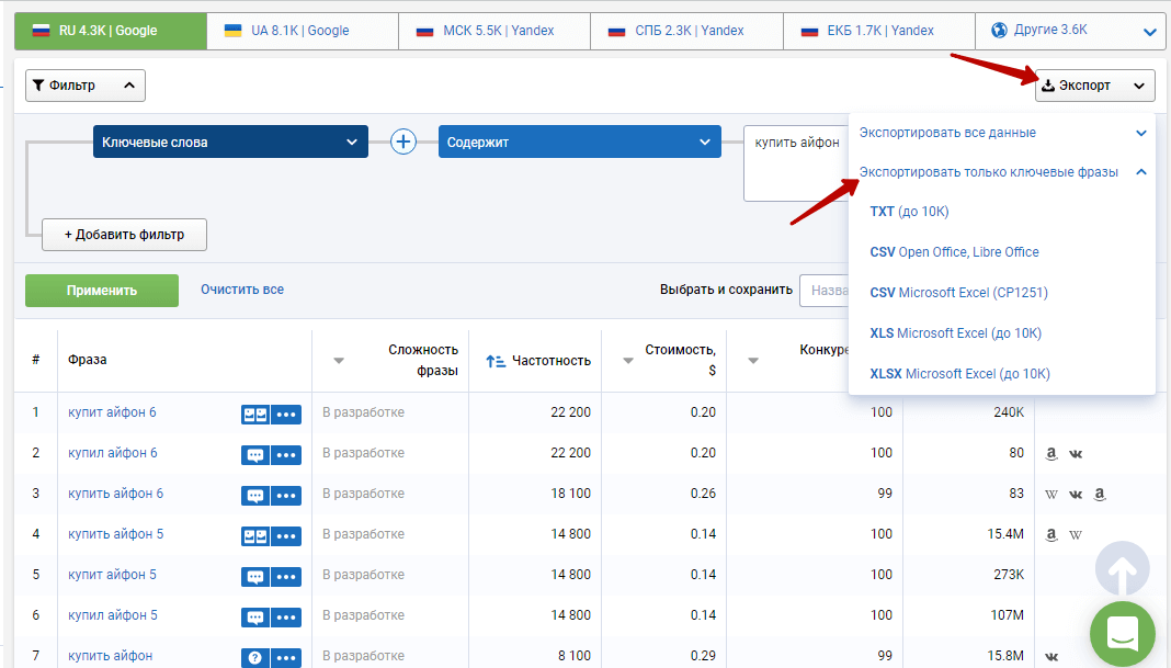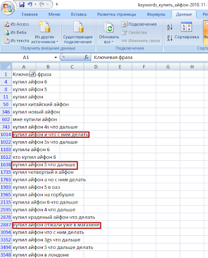 Теперь можно таким же образом убрать ключи, которые содержат слова [купи], [купит], [чехол], [бампер], [какой] и прочее. Это требует немного времени и усидчивости.