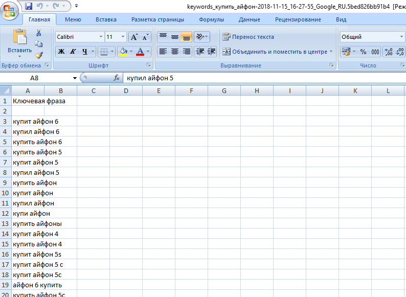 Загружаем ключи в формате Excel-файла. Теперь нужно перебрать ключи, убрать мусор или не подходящие именно вам.